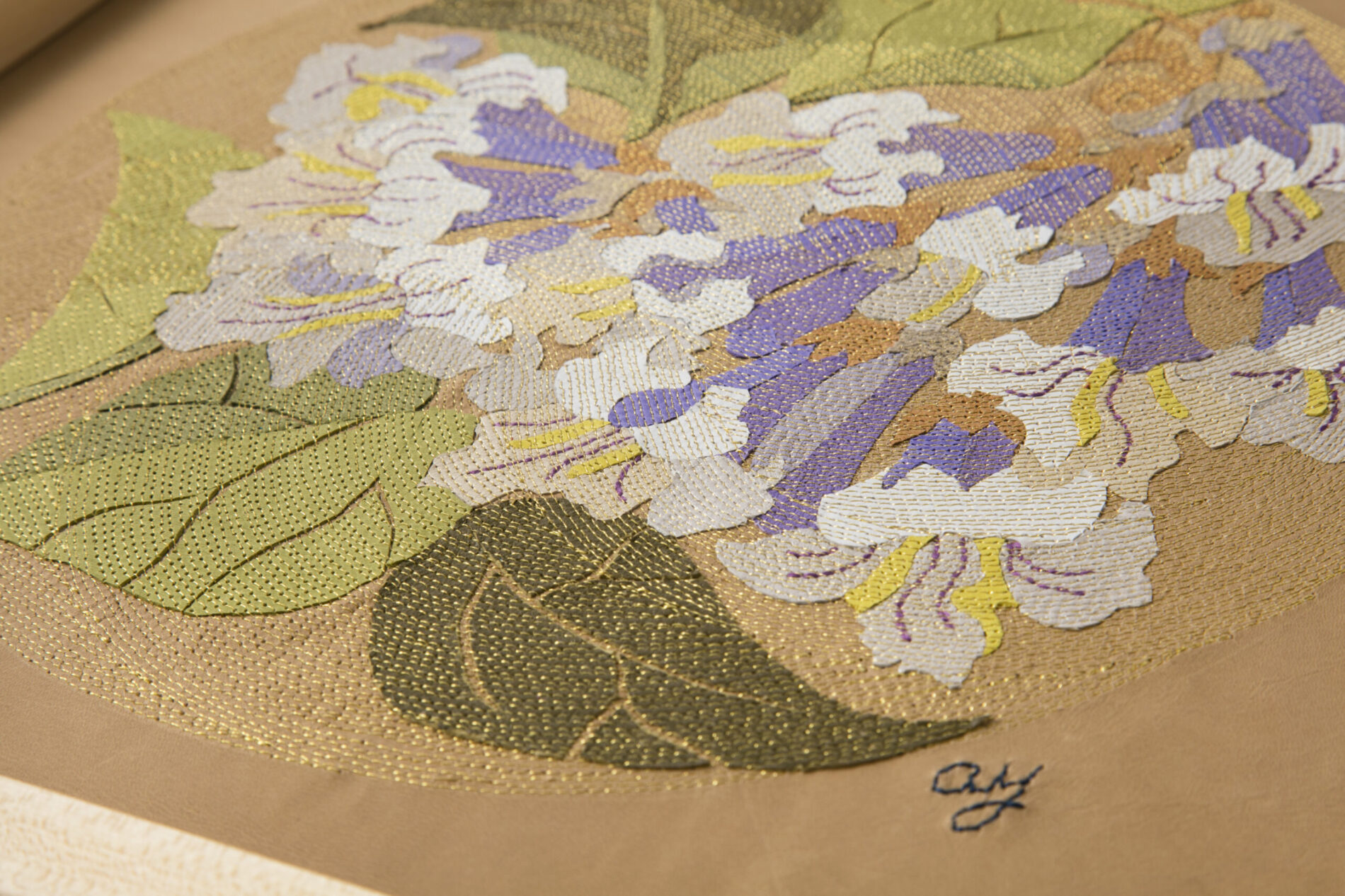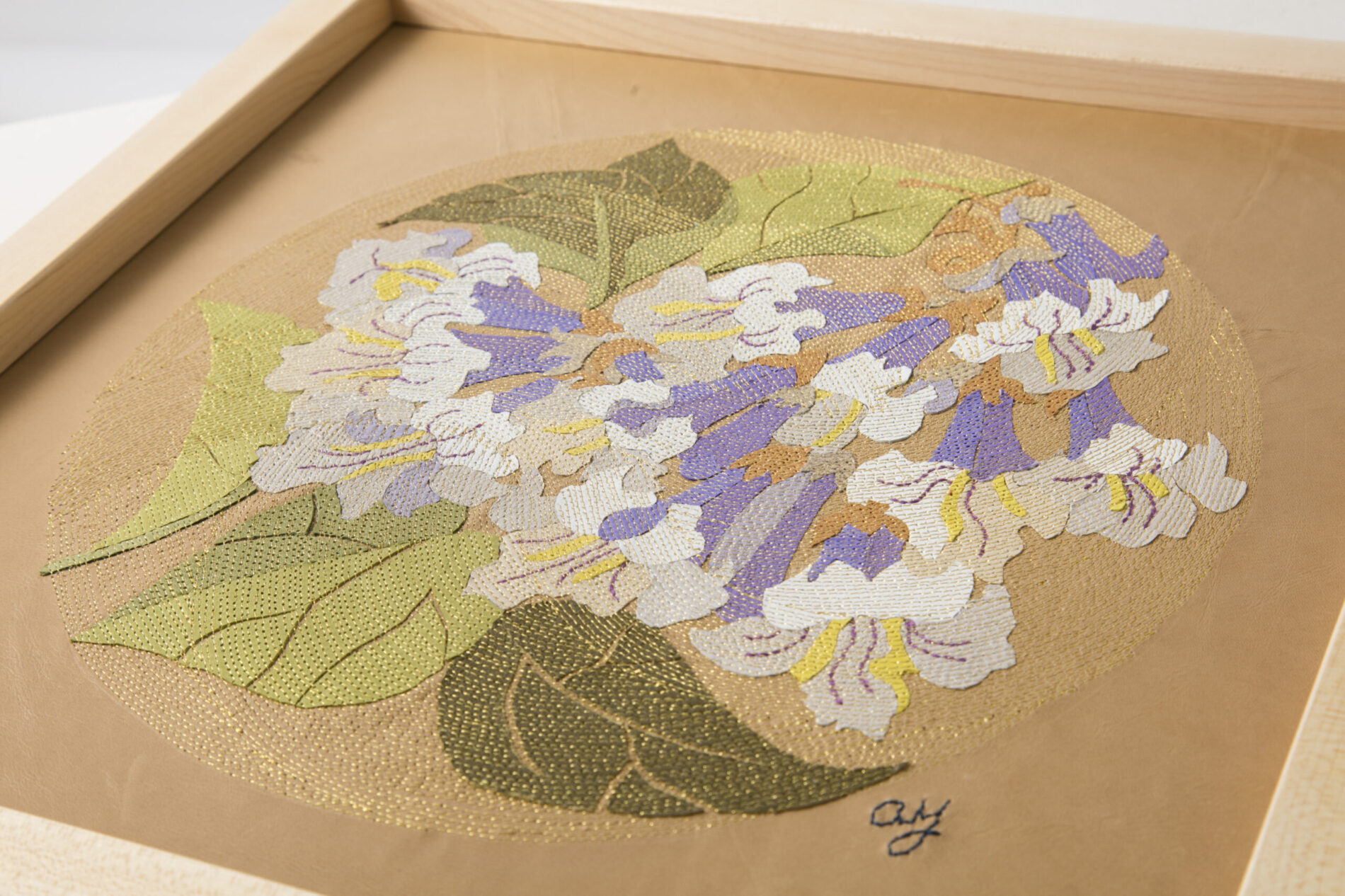 『新花丸図』は、薄く漉いた革の断片を貼り合わせ、1ミリごとの縫い目で流れを描き出す「レザーコラージュ&ステッチ」によるアートパネルシリーズです。円環の中に花や蝶を配し、生命の循環と記憶を革という素材に刻み込みました。 “The Flower Circle” is a series of art panels created with the technique of “Leather Collage & Stitch,” in which fragments of finely skived leather are layered and stitched at 1-millimeter intervals to generate flowing rhythms. Within circular compositions, flowers and butterflies are arranged, inscribing the cycles of life and memory into the medium of leather.