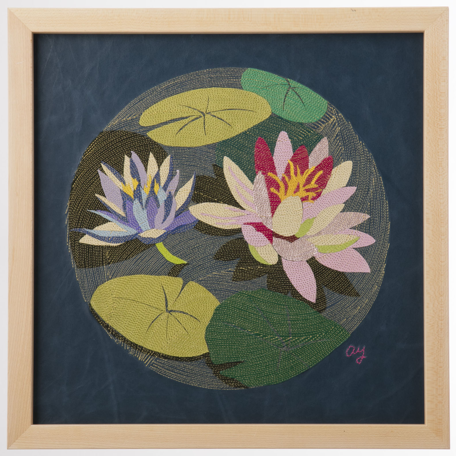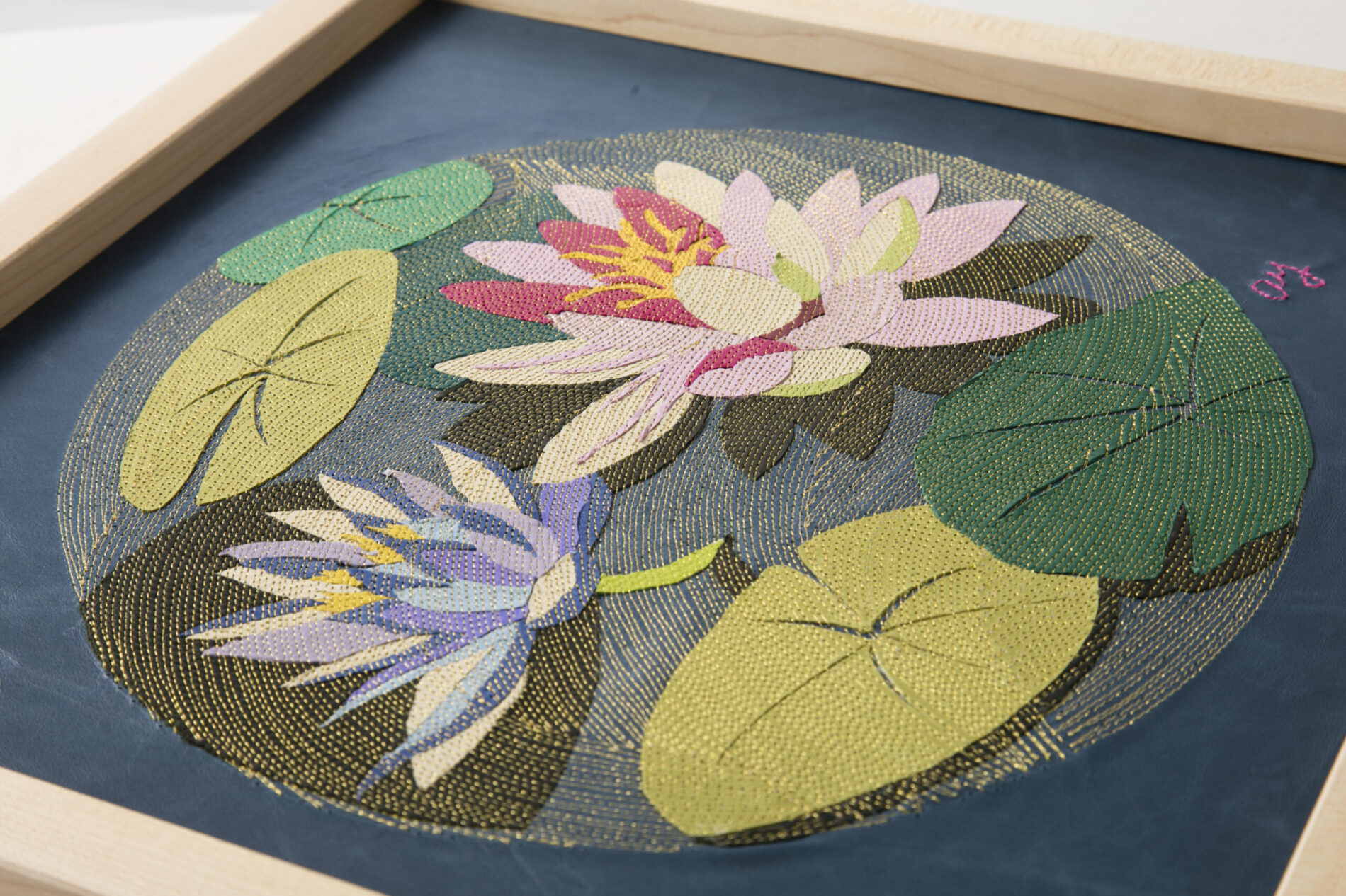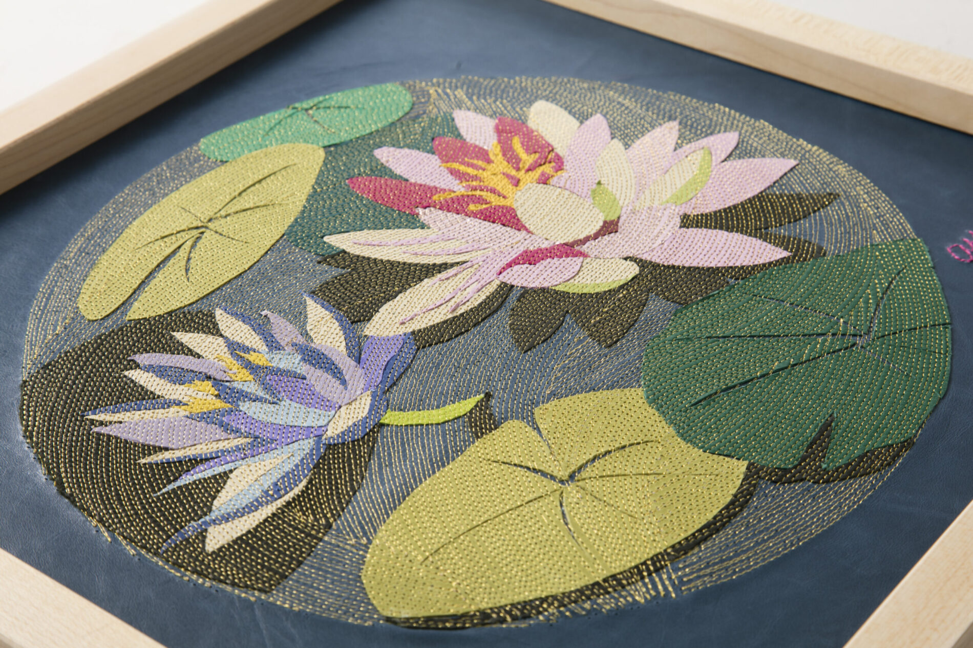 『新花丸図』は、薄く漉いた革の断片を貼り合わせ、1ミリごとの縫い目で流れを描き出す「レザーコラージュ&ステッチ」によるアートパネルシリーズです。円環の中に花や蝶を配し、生命の循環と記憶を革という素材に刻み込みました。 “The Flower Circle” is a series of art panels created with the technique of “Leather Collage & Stitch,” in which fragments of finely skived leather are layered and stitched at 1-millimeter intervals to generate flowing rhythms. Within circular compositions, flowers and butterflies are arranged, inscribing the cycles of life and memory into the medium of leather.