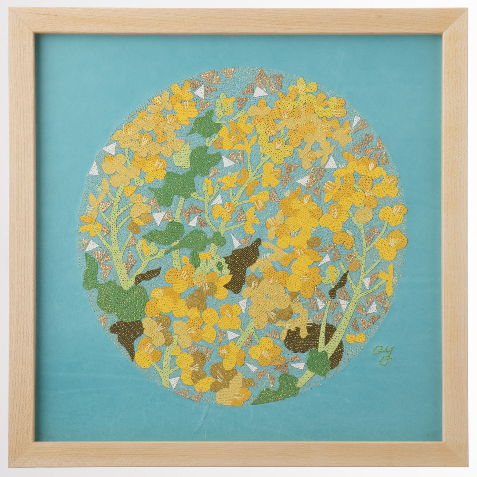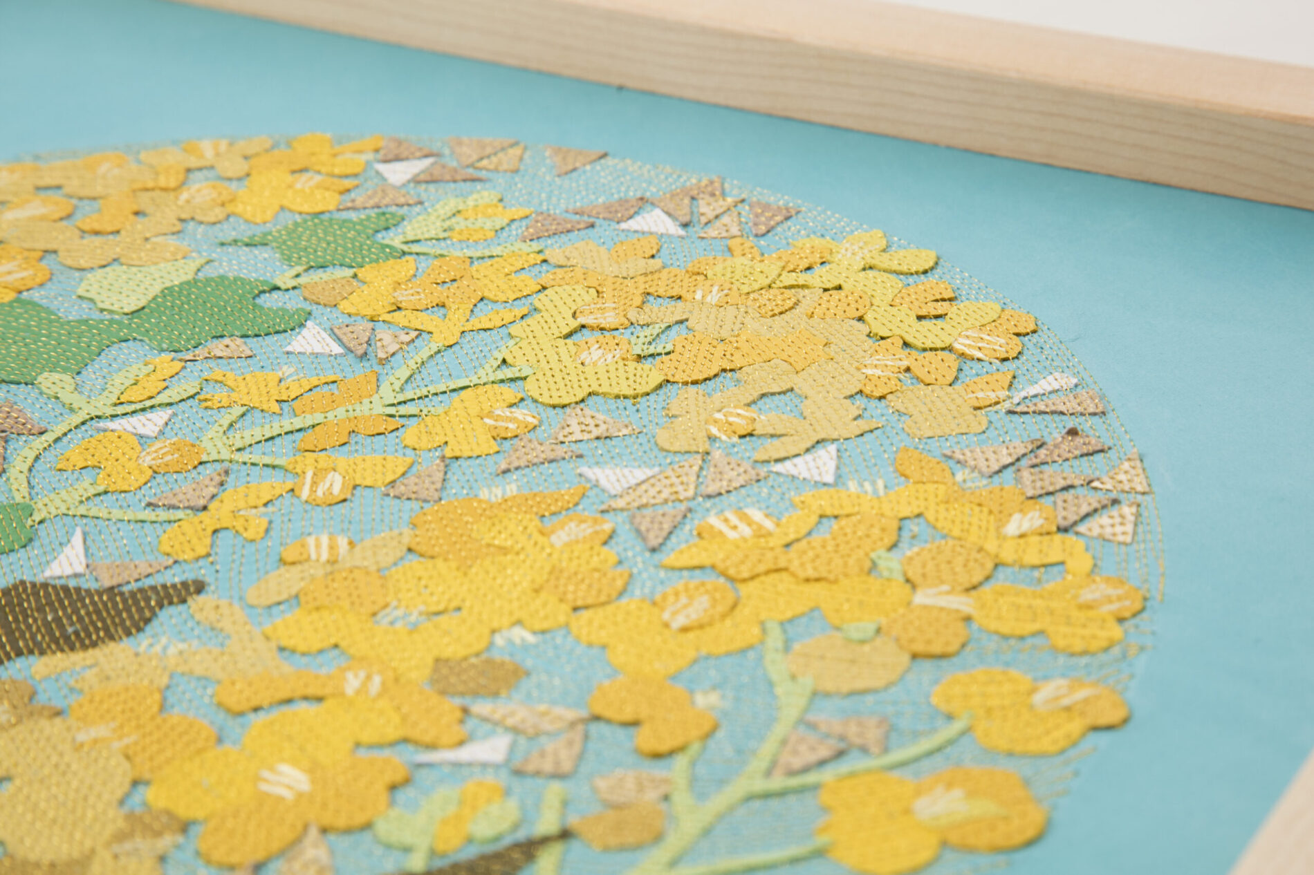 “The Flower Circle” is a series of art panels created with the technique of “Leather Collage & Stitch,” in which fragments of finely skived leather are layered and stitched at 1-millimeter intervals to generate flowing rhythms. Within circular compositions, flowers and butterflies are arranged, inscribing the cycles of life and memory into the medium of leather.