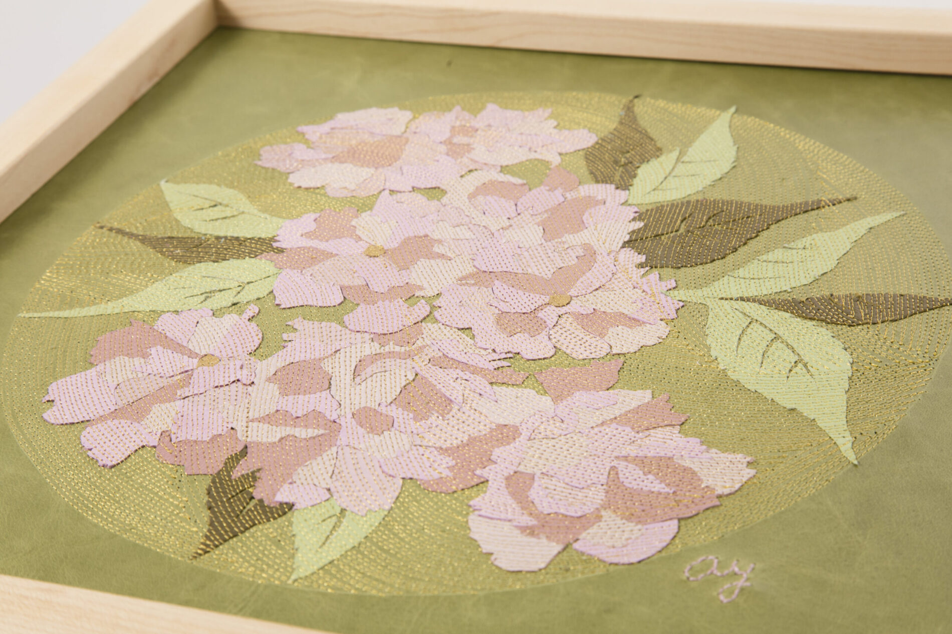“The Flower Circle” is a series of art panels created with the technique of “Leather Collage & Stitch,” in which fragments of finely skived leather are layered and stitched at 1-millimeter intervals to generate flowing rhythms. Within circular compositions, flowers and butterflies are arranged, inscribing the cycles of life and memory into the medium of leather.