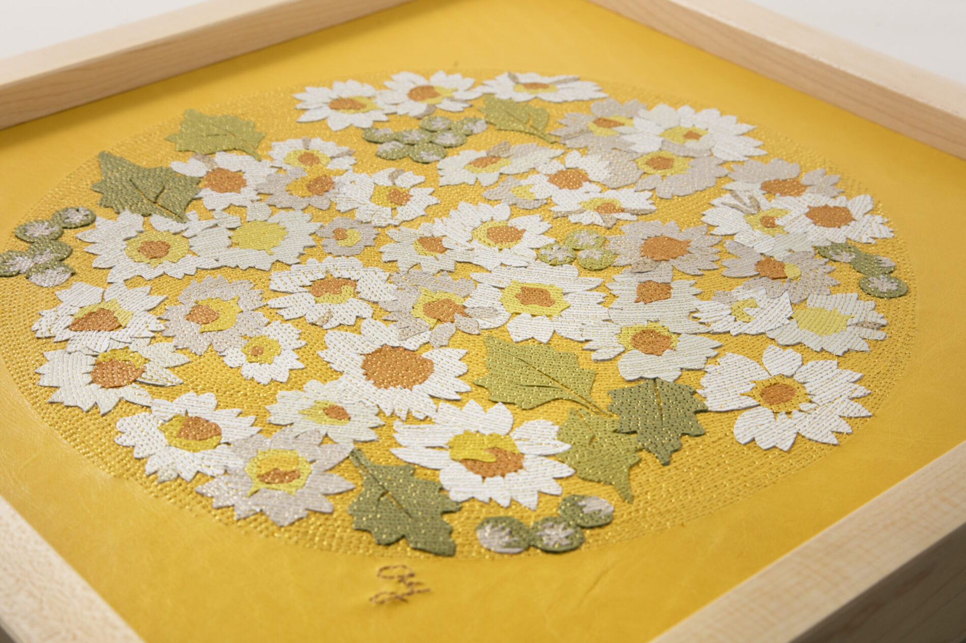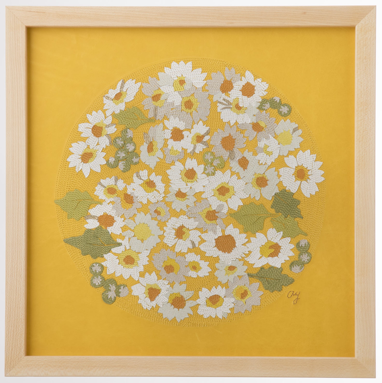 “The Flower Circle” is a series of art panels created with the technique of “Leather Collage & Stitch,” in which fragments of finely skived leather are layered and stitched at 1-millimeter intervals to generate flowing rhythms. Within circular compositions, flowers and butterflies are arranged, inscribing the cycles of life and memory into the medium of leather.