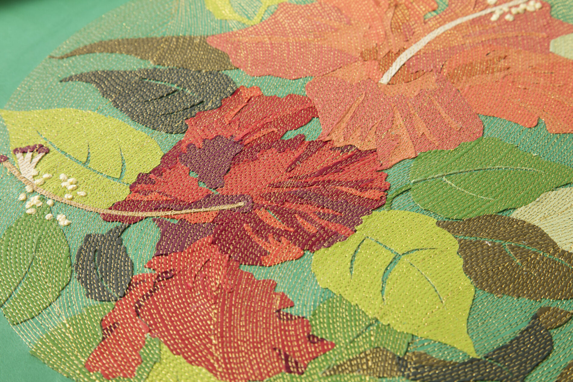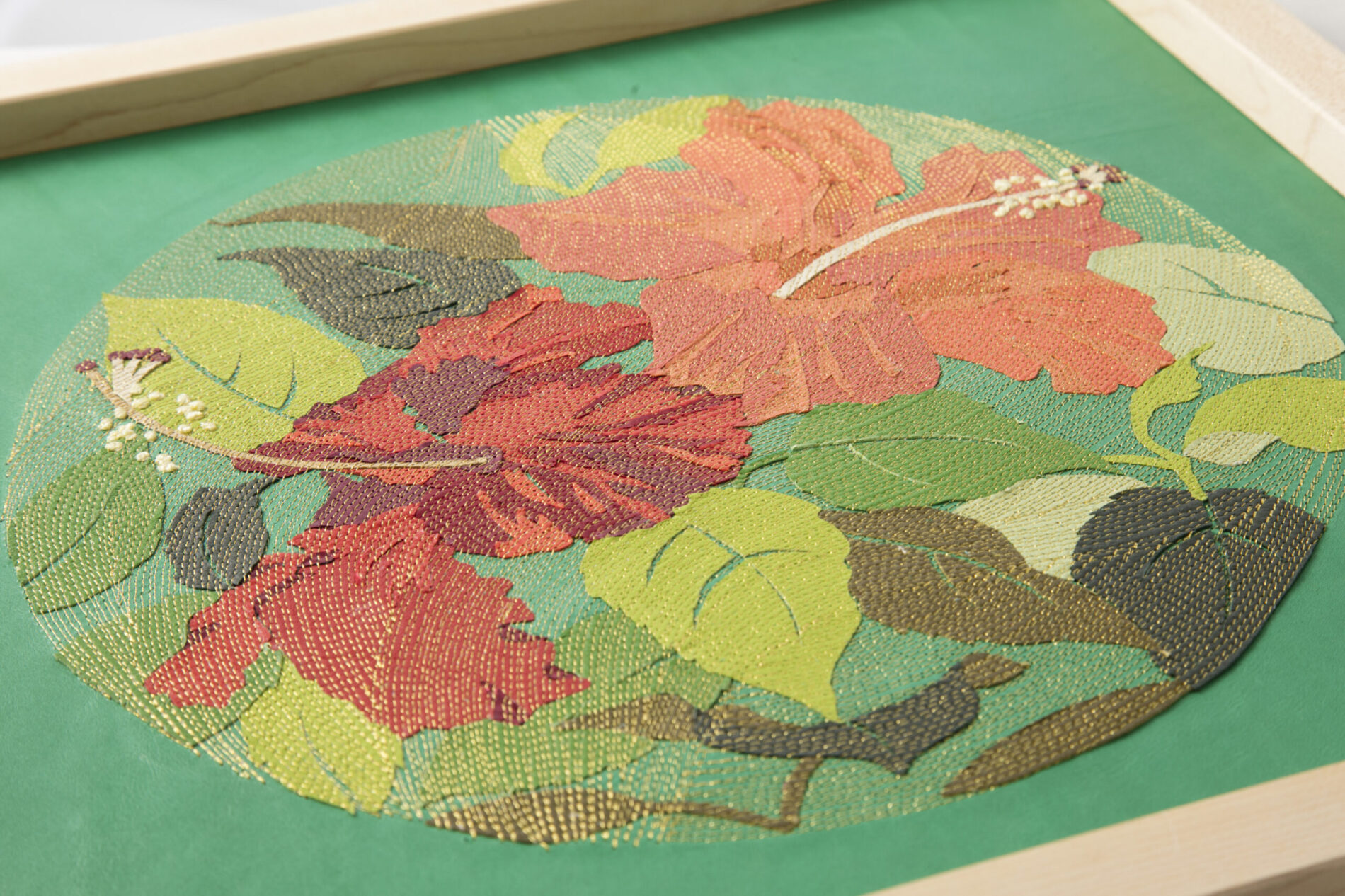 『新花丸図』は、薄く漉いた革の断片を貼り合わせ、1ミリごとの縫い目で流れを描き出す「レザーコラージュ&ステッチ」によるアートパネルシリーズです。円環の中に花や蝶を配し、生命の循環と記憶を革という素材に刻み込みました。 “The Flower Circle” is a series of art panels created with the technique of “Leather Collage & Stitch,” in which fragments of finely skived leather are layered and stitched at 1-millimeter intervals to generate flowing rhythms. Within circular compositions, flowers and butterflies are arranged, inscribing the cycles of life and memory into the medium of leather.