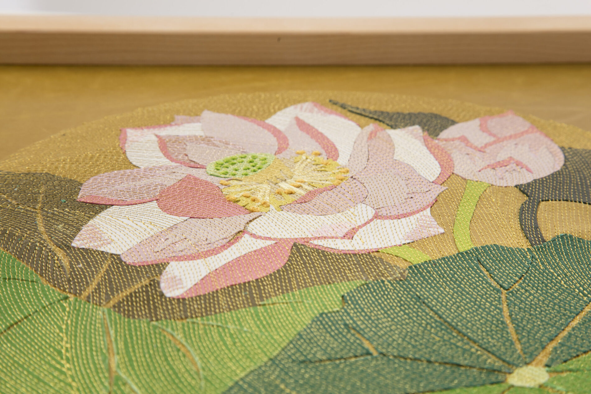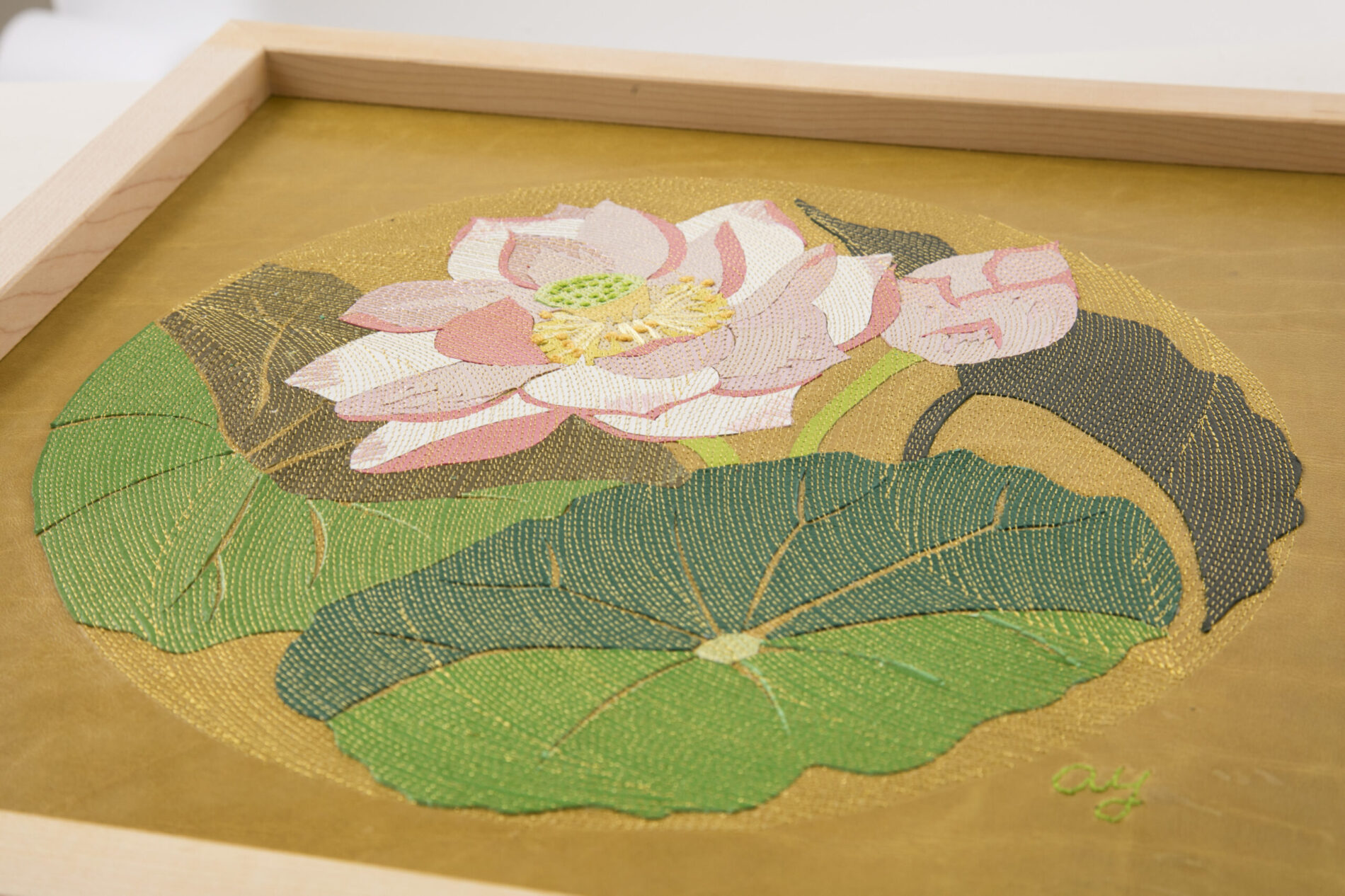『新花丸図』は、薄く漉いた革の断片を貼り合わせ、1ミリごとの縫い目で流れを描き出す「レザーコラージュ&ステッチ」によるアートパネルシリーズです。円環の中に花や蝶を配し、生命の循環と記憶を革という素材に刻み込みました。