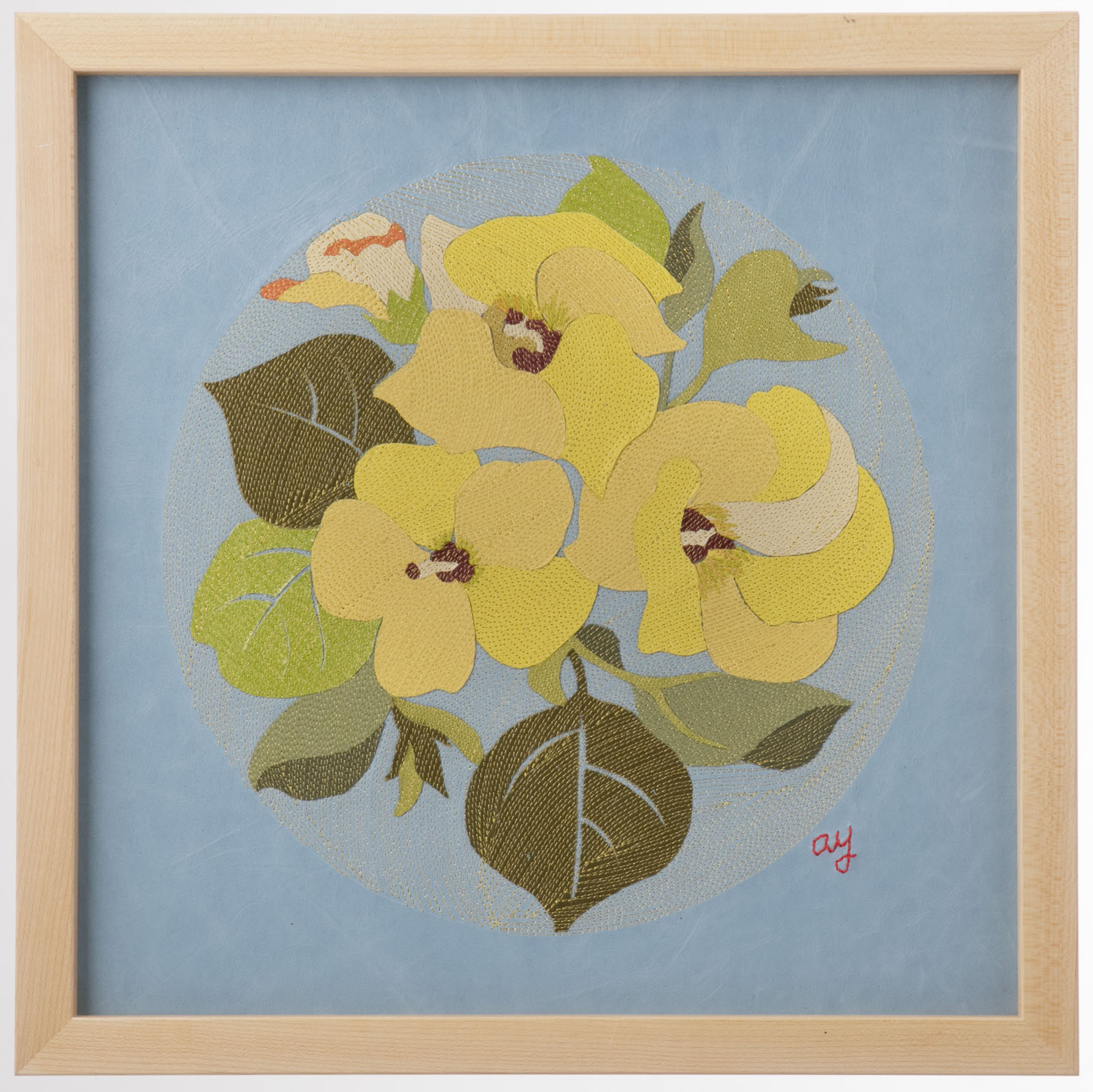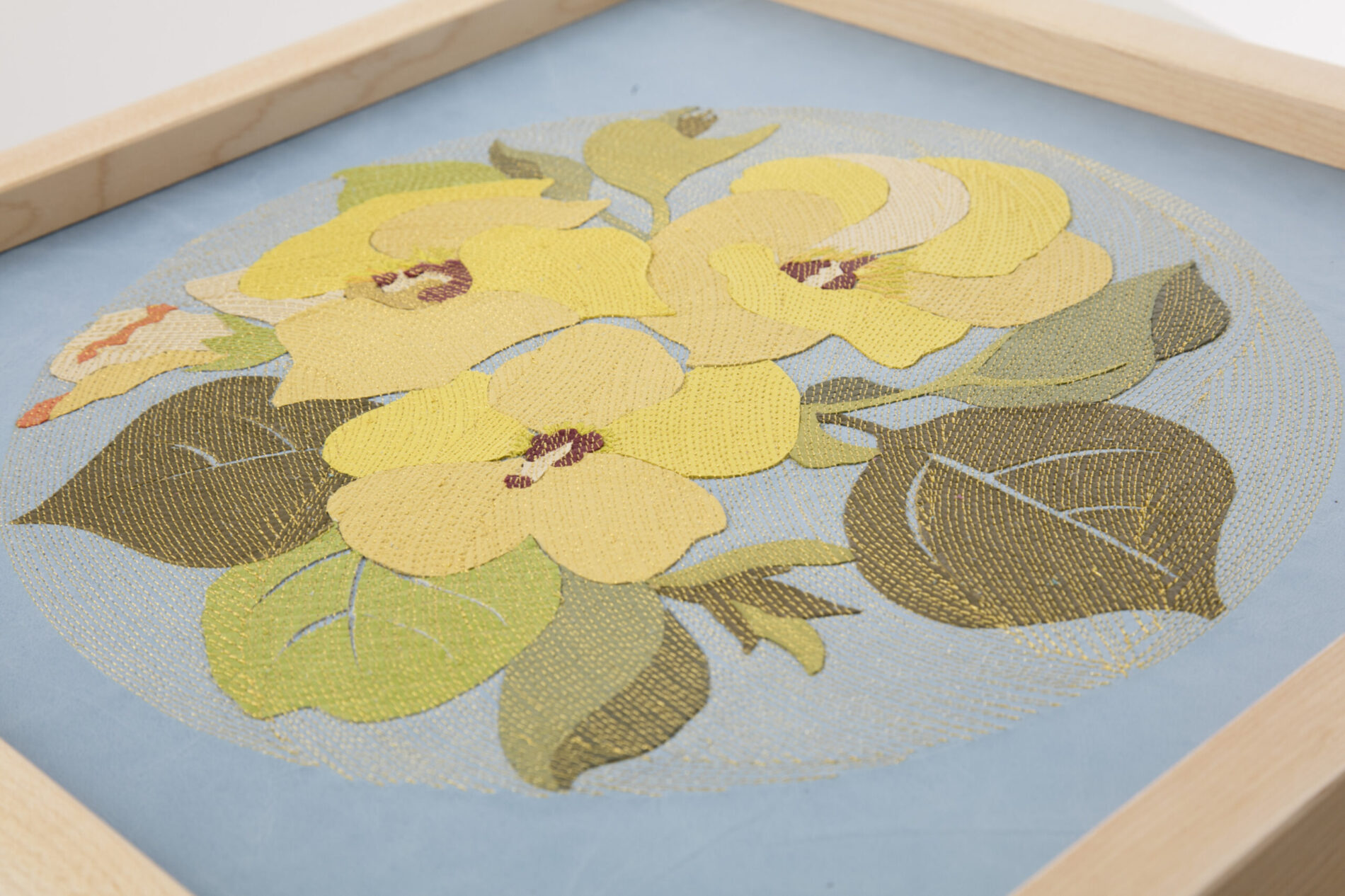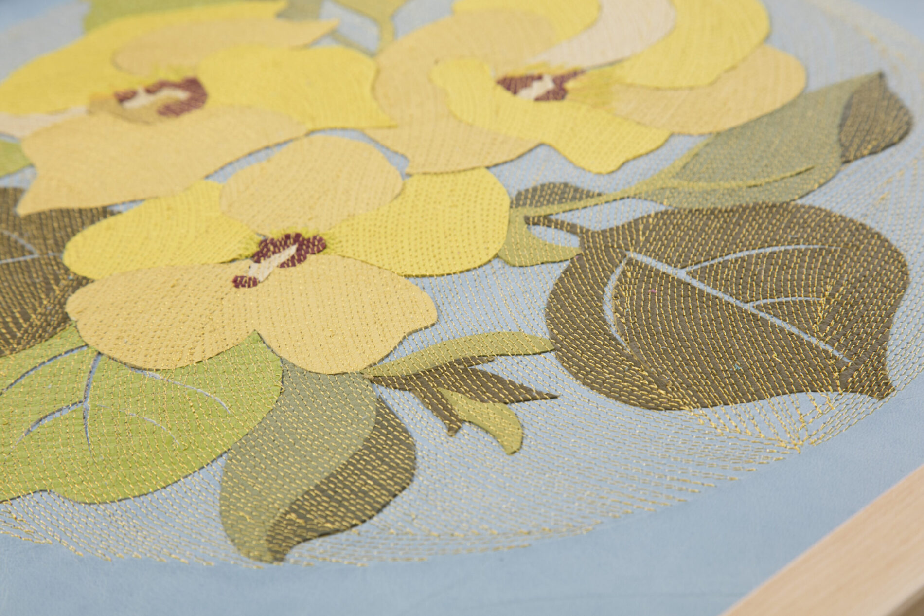 『新花丸図』は、薄く漉いた革の断片を貼り合わせ、1ミリごとの縫い目で流れを描き出す「レザーコラージュ&ステッチ」によるアートパネルシリーズです。円環の中に花や蝶を配し、生命の循環と記憶を革という素材に刻み込みました。