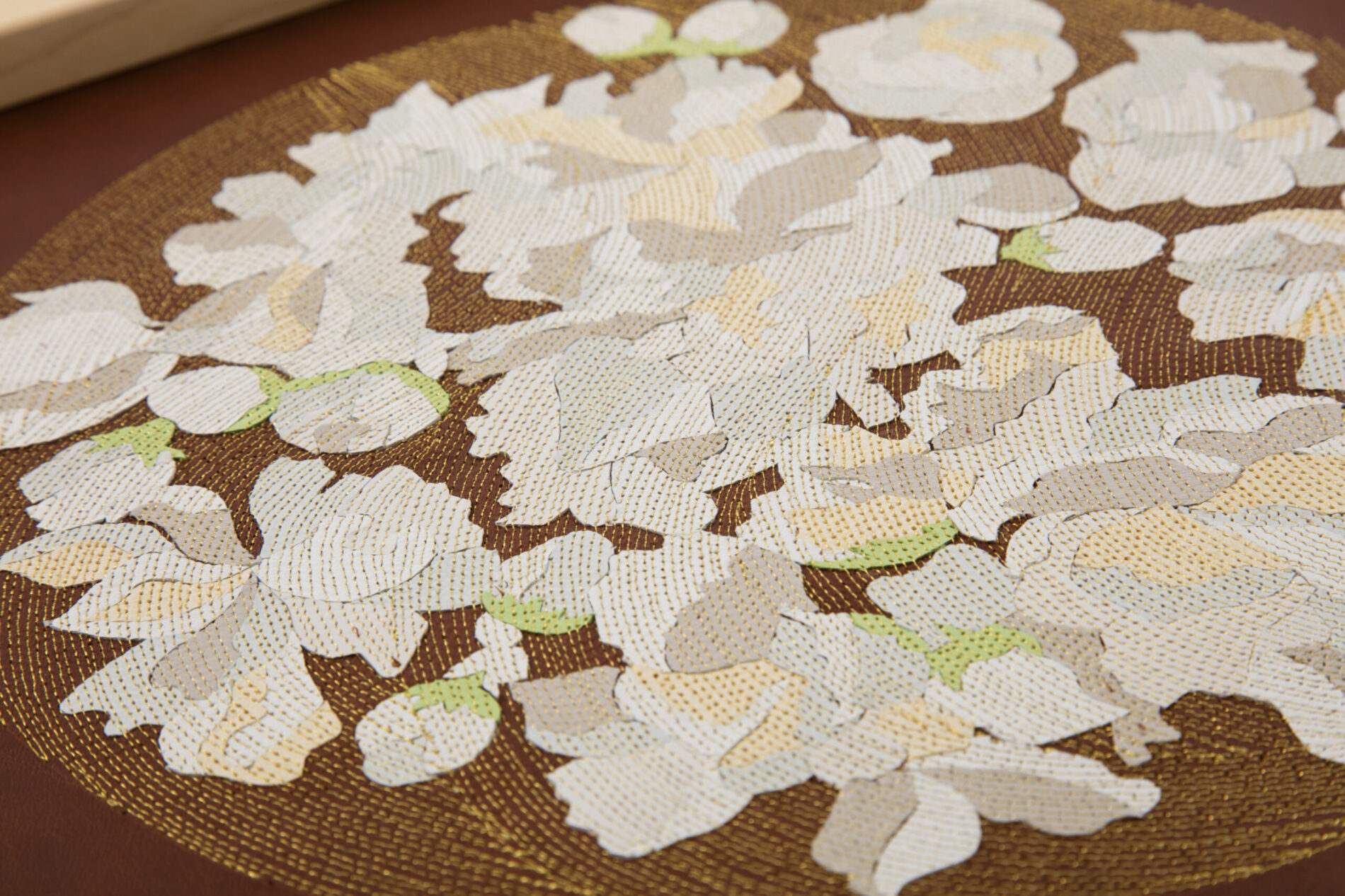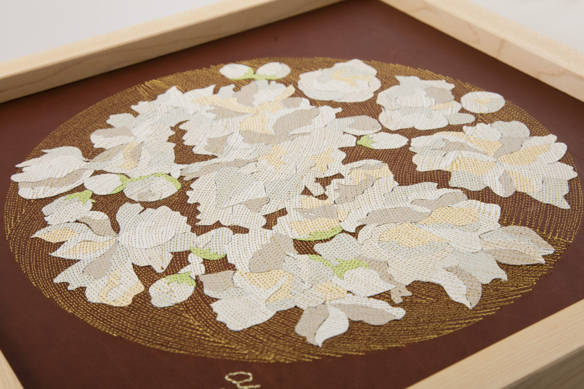 『新花丸図』は、薄く漉いた革の断片を貼り合わせ、1ミリごとの縫い目で流れを描き出す「レザーコラージュ&ステッチ」によるアートパネルシリーズです。円環の中に花や蝶を配し、生命の循環と記憶を革という素材に刻み込みました。 “The Flower Circle” is a series of art panels created with the technique of “Leather Collage & Stitch,” in which fragments of finely skived leather are layered and stitched at 1-millimeter intervals to generate flowing rhythms. Within circular compositions, flowers and butterflies are arranged, inscribing the cycles of life and memory into the medium of leather.