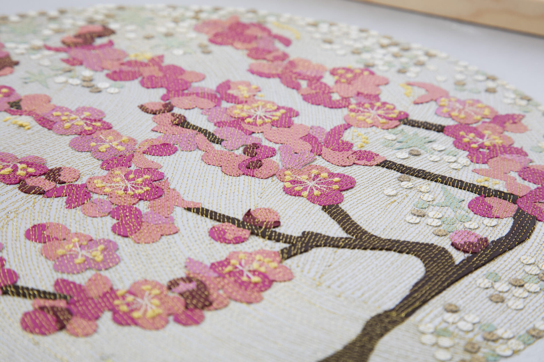 『新花丸図』は、薄く漉いた革の断片を貼り合わせ、1ミリごとの縫い目で流れを描き出す「レザーコラージュ&ステッチ」によるアートパネルシリーズです。円環の中に花や蝶を配し、生命の循環と記憶を革という素材に刻み込みました。 “Flower Circle” is a series of art panels created with the technique of “Leather Collage & Stitch,” in which fragments of finely skived leather are layered and stitched at 1-millimeter intervals to generate flowing rhythms. Within circular compositions, flowers and butterflies are arranged, inscribing the cycles of life and memory into the medium of leather.